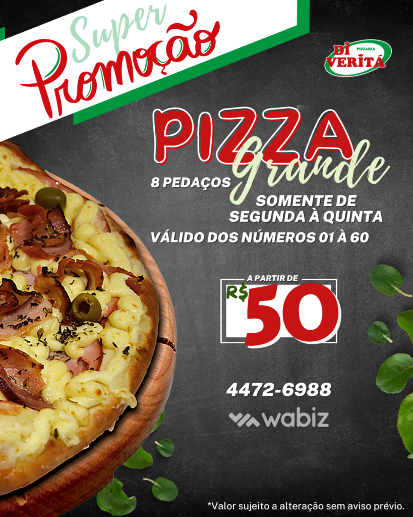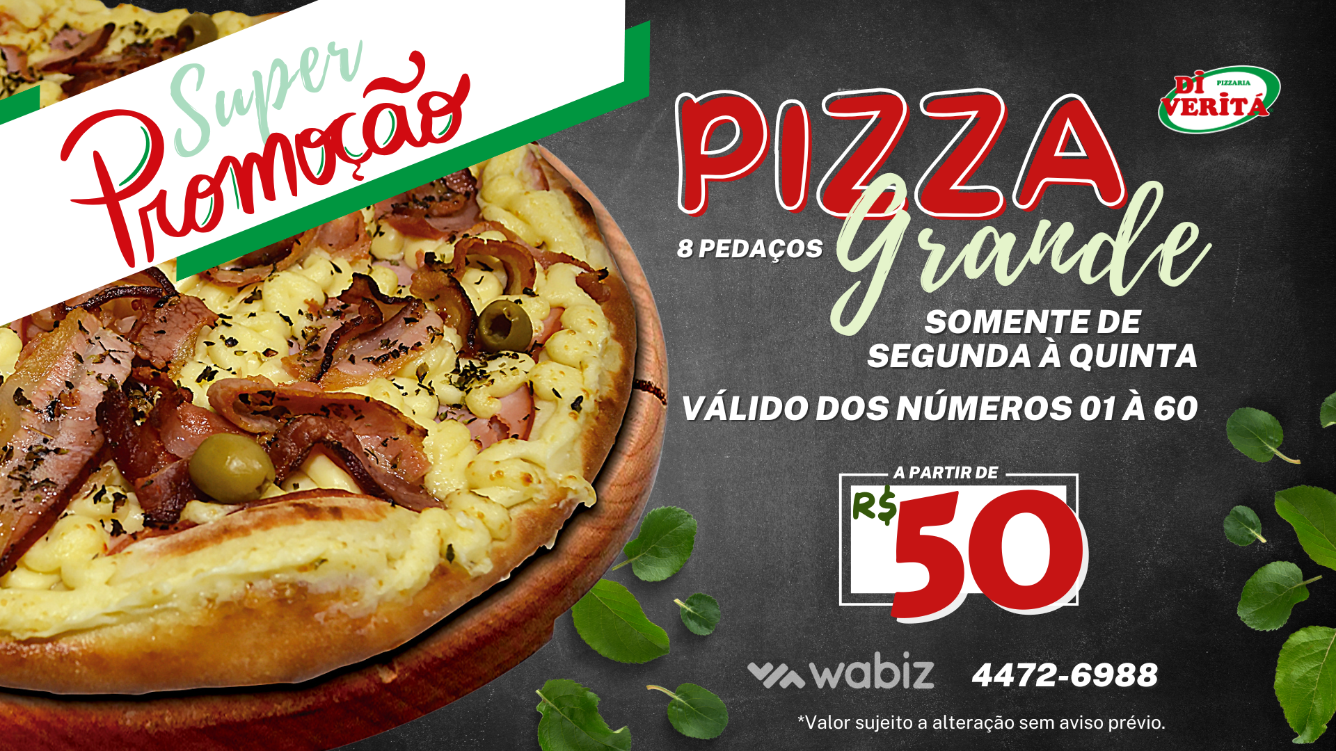 Bem-vindo à Di Veritá, a pizzaria que desde 1987 encanta paladares com pizzas de qualidade a preços acessíveis. Oferecemos entrega rápida em até 5 km, sempre mantendo o sabor e a frescura dos nossos produtos. Nos atualizando sempre para aprimorar ainda mais nossa eficiência.